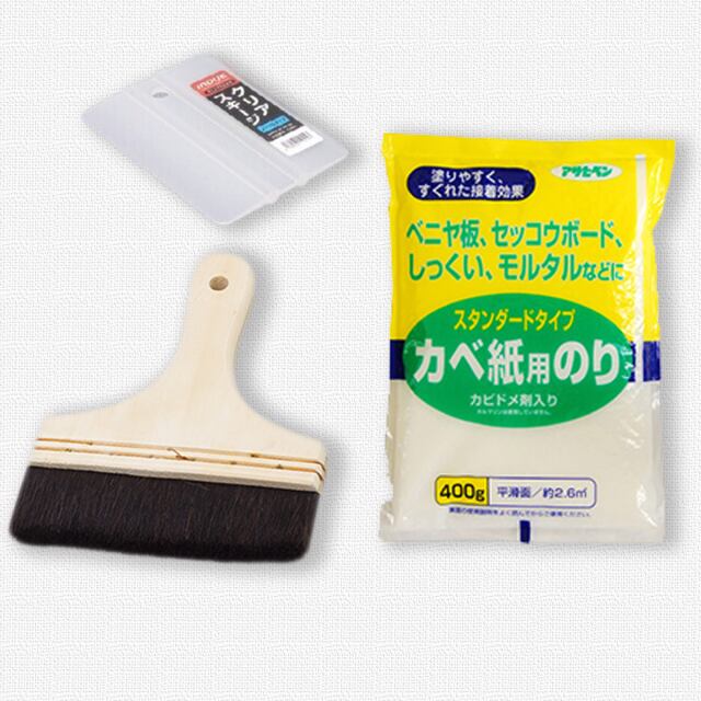 のりは、ホルマリンは使用していません。建築基準法対応壁紙施工用でん粉系接着剤F☆☆☆☆(建築基準法で定めたホルムアルデヒドの発散量が最も少ない区分で、安心安全に使用できます)